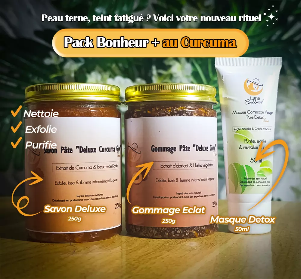 Le Pack Bonheur Plus est une routine complète qui associe savon, gommage et crème pour un teint éclatant et unifié.